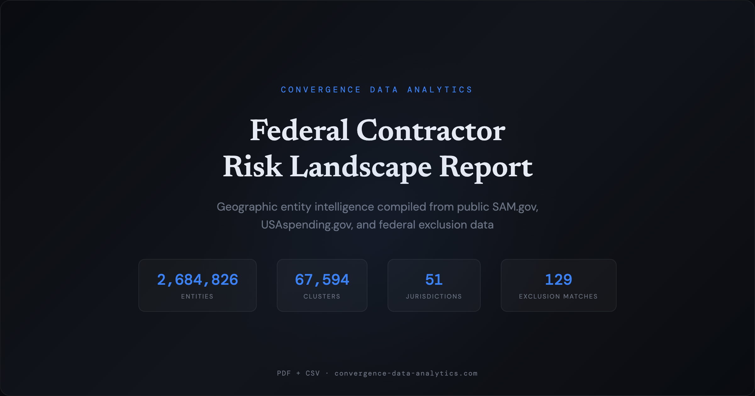 Our analysis of 2,684,826 SAM.gov entities organized into 70,115 address clusters found that 129 clusters nationally contain at least one entity matching an exclusion record. That is roughly 1 in 524 clusters — uncommon but not rare, and heavily concentrated in certain states.